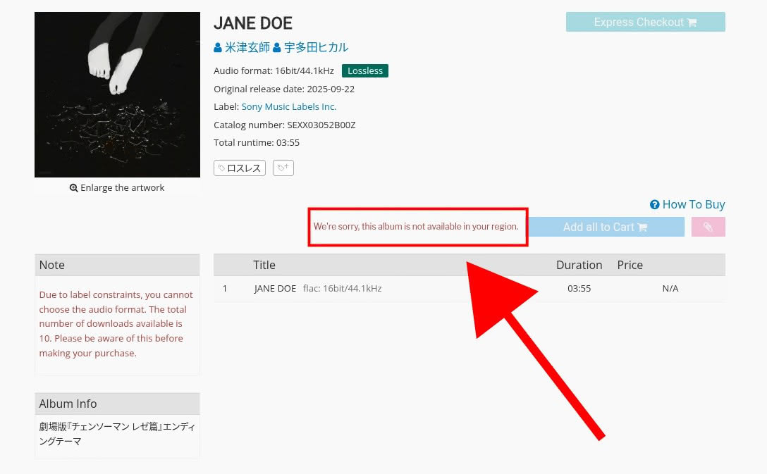 บางเพลงจะซื้อนอกญี่ปุ่นไม่ได้ครับ วิธีสังเกตง่ายๆ คือ ถ้าเข้าไปแล้วกดฟังเพลงไม่ได้หรือมีข้อความ “We’re sorry, this album is not available in your region” จะเป็นแบบ Region-lock ครับ ซื้อได้แค่ที่ญี่ปุ่นเท่านั้น (แต่ใช้ VPN ช่วยได้)
